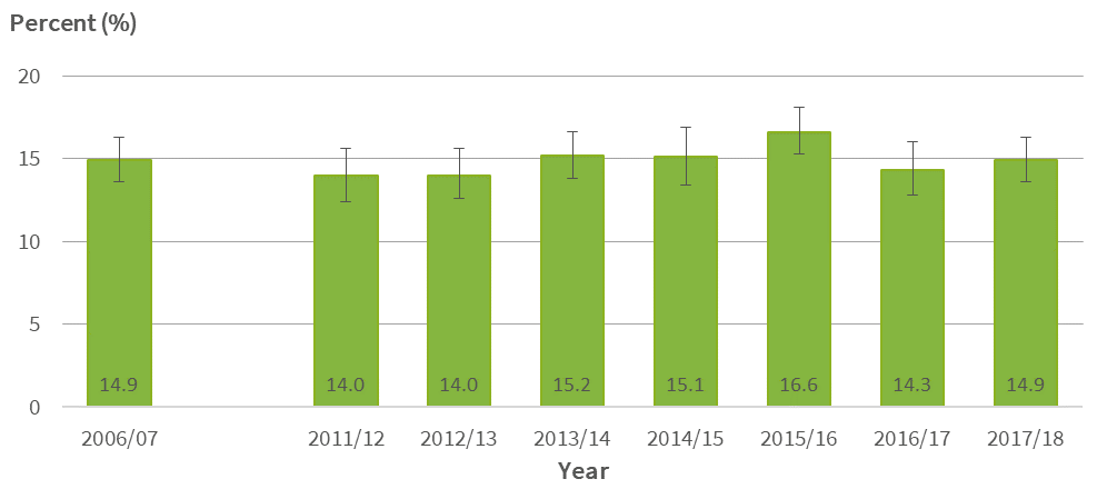 Fig 5: Medicated asthma, children aged 2-14 years, 2006/07-2017/18 (unadjusted prevalence)
