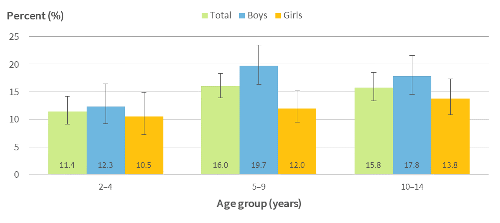 Read more about "Fig 6: Medicated asthma, children aged 2-14 years, by sex and age group, 2017/18 (unadjusted prevalence)"... -