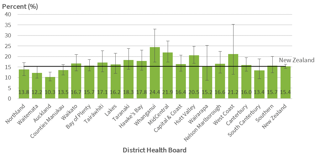 Read more about "Fig 8: Medicated asthma, children aged 2-14 years, by DHB, 2014-17 (unadjusted prevalence)"... -