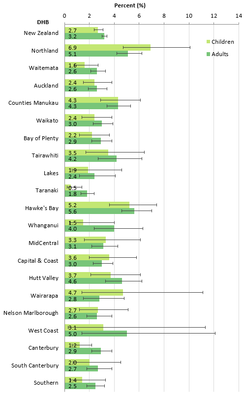Fig 4: Unmet need for GP services due to lack of transport in the last 12 months, by District Health Board (DHB), 2014–17 (unadjusted prevalence and 95% confidence intervals)