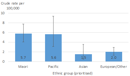 Fig 5: Meningococcal disease notification rate, by prioritised ethnic group, children aged 0–14 years, 2014–16 (crude rate per 100,000)