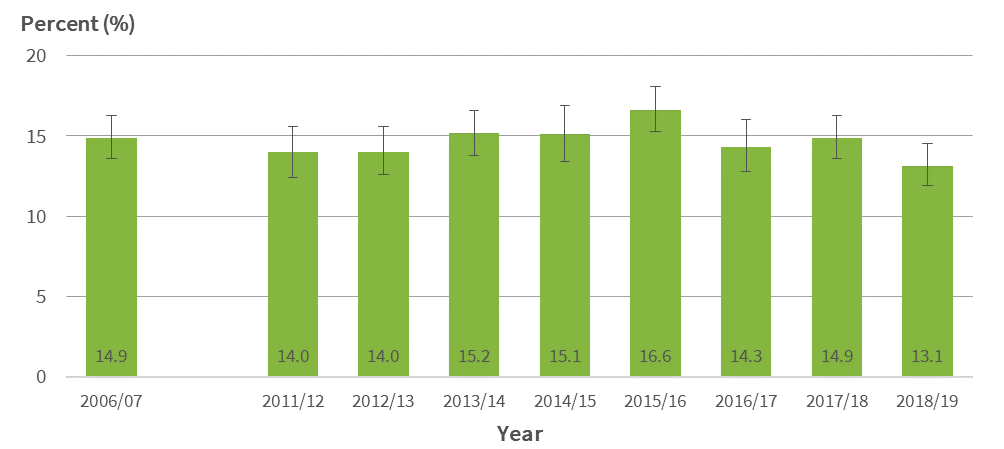 Fig 7: Medicated asthma, children aged 2-14 years, 2006/07-2018/19 (unadjusted prevalence)